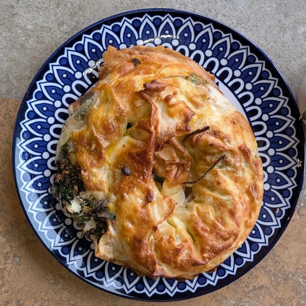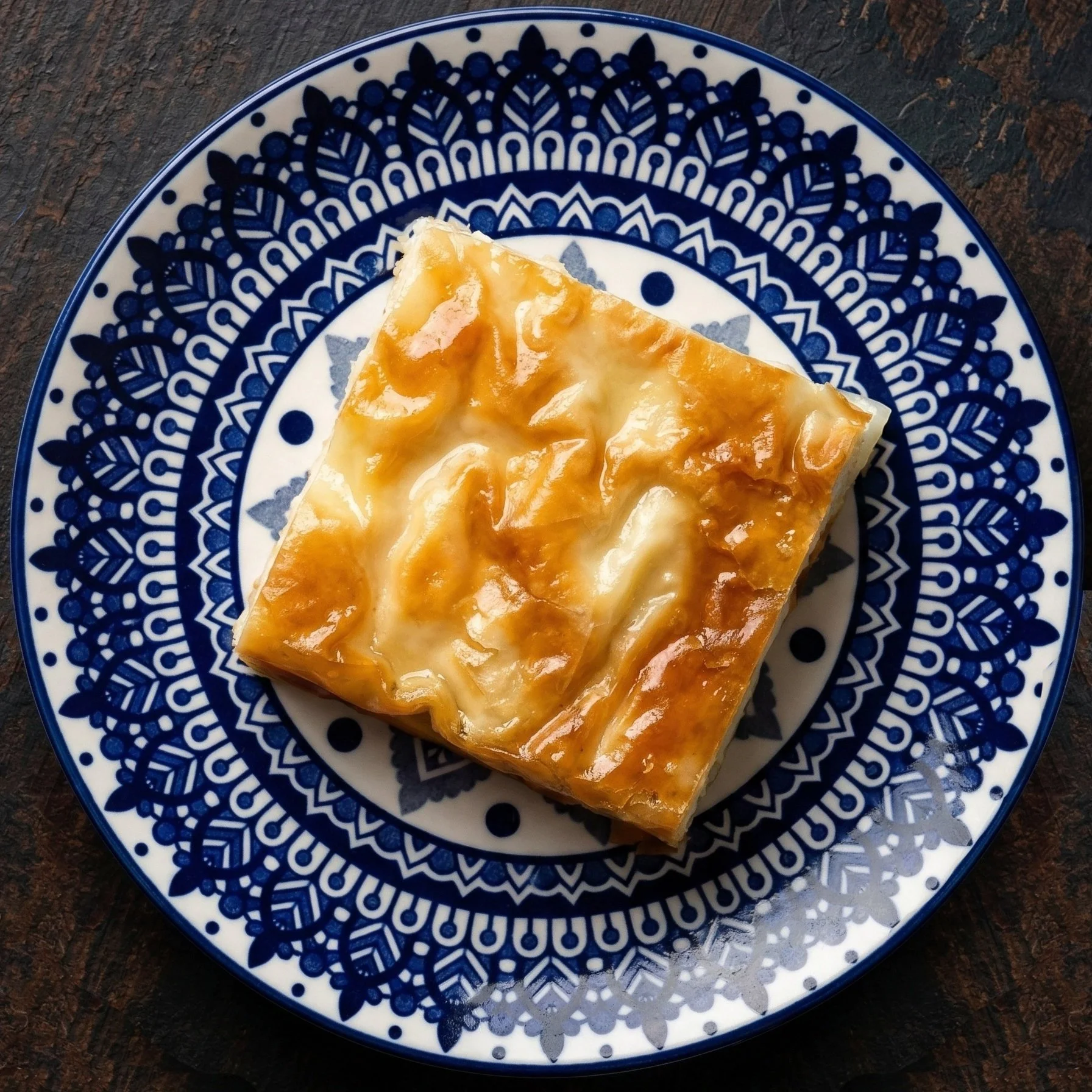 (bur-ECK, Water Pastry) Tender, lasagna-like layers of dough filled with boiled dough and Feta Cheese.