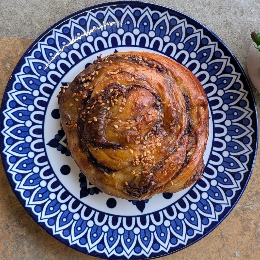 (EYE chur-eh-EE, a Moon Crescent) Flaky, crescent-shaped Croissant filled with Cocoa, Nuts, and Cinnamon.