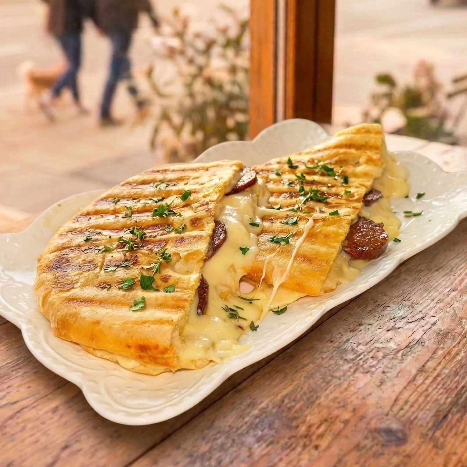 (soo-DJOOK, Toast with Turkish Sausage) A pressed sandwich (like a Panini) with Cheese and Sucuk (spicy, fermented, and dried Beef sausage).