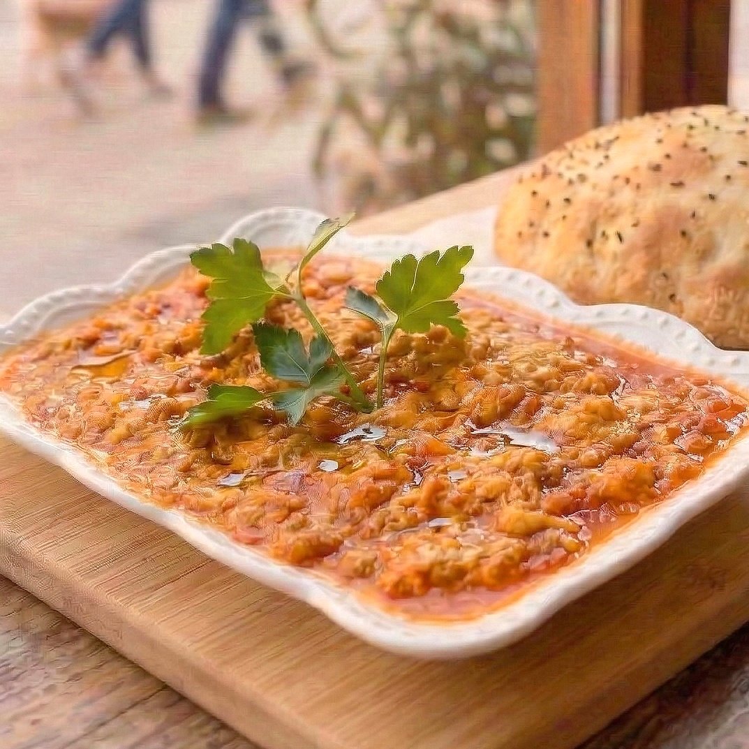 (kah-voor-MAH) Turkish-style Fried Eggs topped with savoury, Sautéed/Roasted, Diced Beef (Kavurma), garnished with cherry Tomatoes.