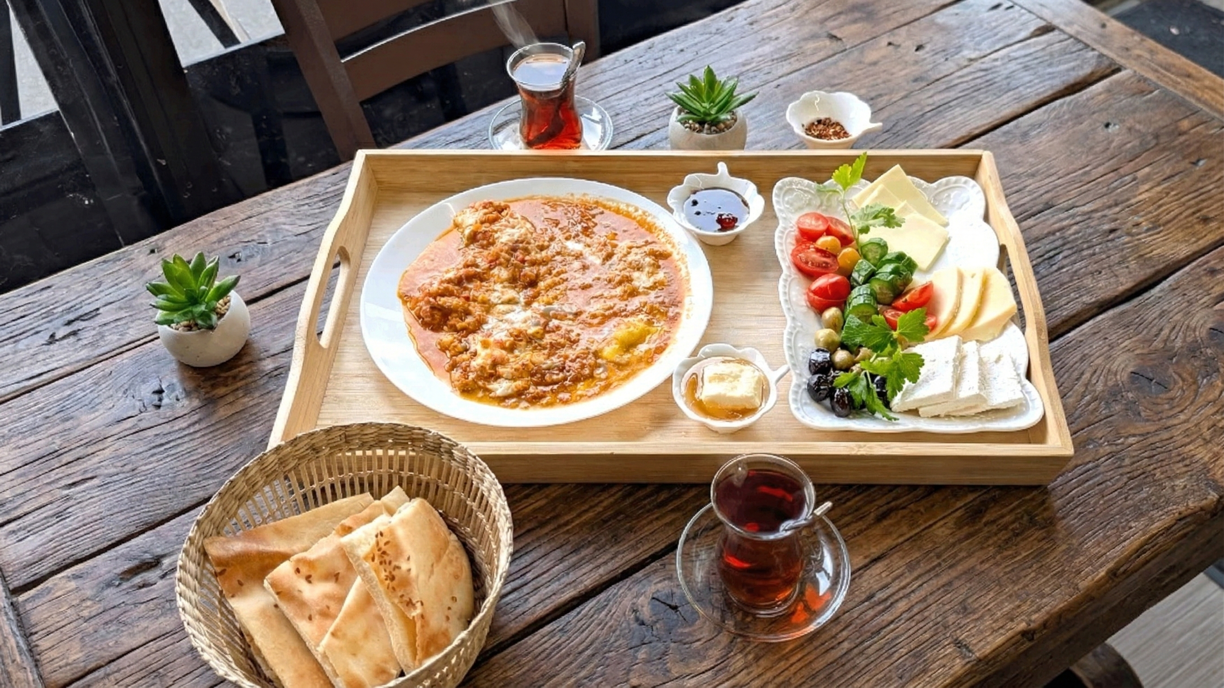 Includes Menemen (Easy Eggs, Tomatoes, Peppers), Black Olives, Green Olives, Tomatoes, Cucumbers, Parsley Garnish, Feta Cheese, Mozzarella Cheese, Laughing Cow Cheese, Butter, Honey, Jam, Pita Bread and complimentary Turkish Tea.