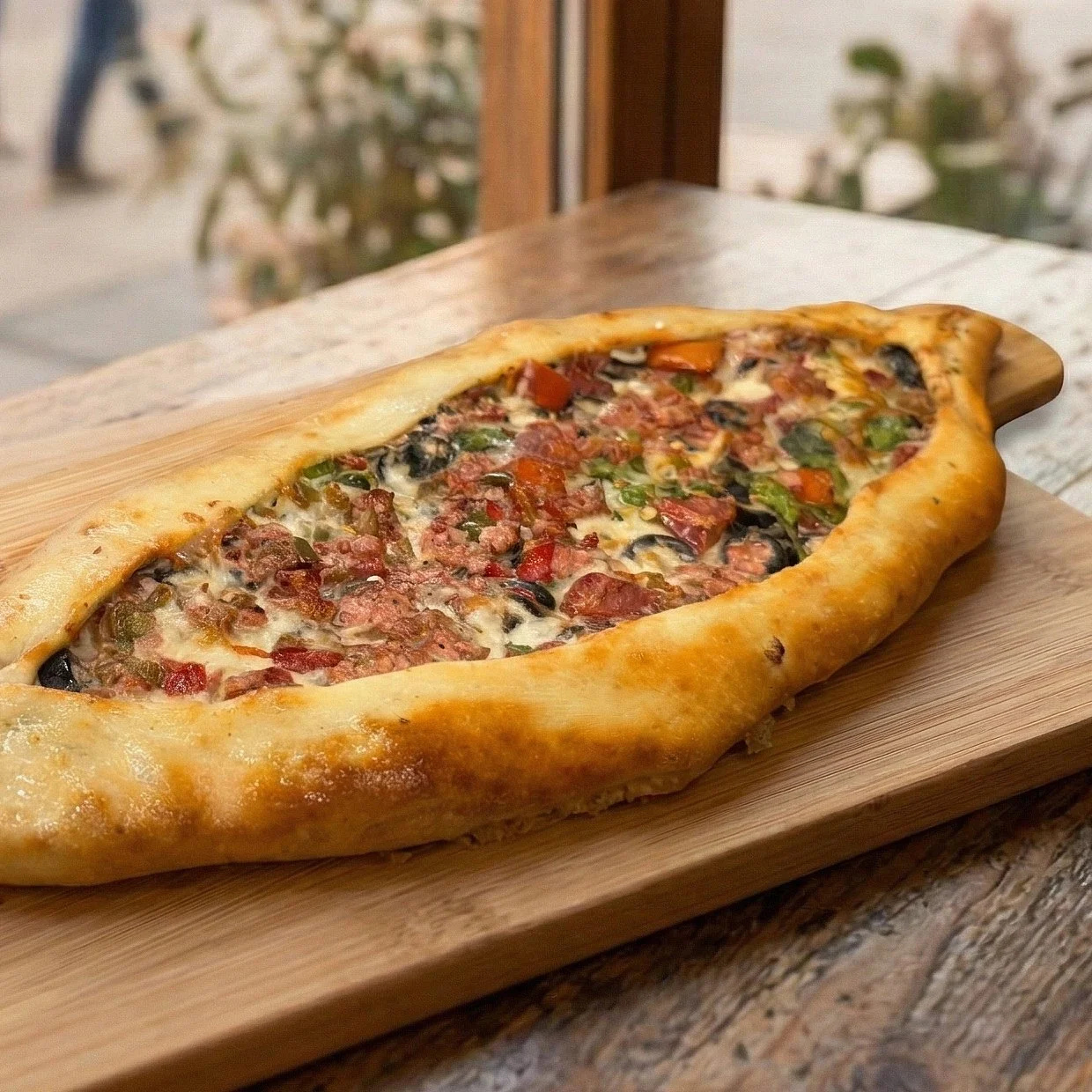 (PEE-deh, Turkish Pizza) Boat-shaped flatbread topped with melting Cheese, savoury Meat, Eggs or Herbs.
