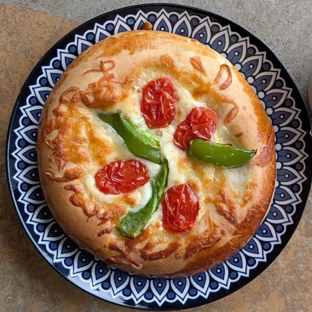 Our signature miniature Pizza featuring soft, hand-pressed dough with Tomatoes and Peppers.